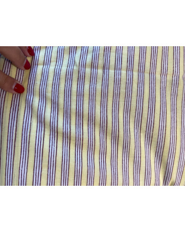 Coton print indien, tissé à la main, imprimé rayure jaune et rouge foncé sur fond blanc. idéal pour la confection de blouse, robe, jupe et pantalon.